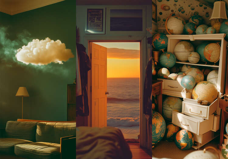 Così, soffici nuvole fluttuanti si fanno spazio tra ambienti domestici, o nelle camere si spalancano porte su mari e cieli infiniti, e la stanza di una giovane viaggiatrice diventa un sogno pieno di mappamondi.