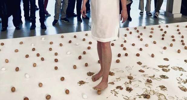La tela su cui Kacziba ha calpestato 500 uova ripiene d’oro, equivalenti circa al numero di ovuli prodotti nel periodo di fertilità di una donna, è stata conservata ed ha ancora intrinseca in sé quella instabilità che necessita di esposizione, asciugatura e cura.