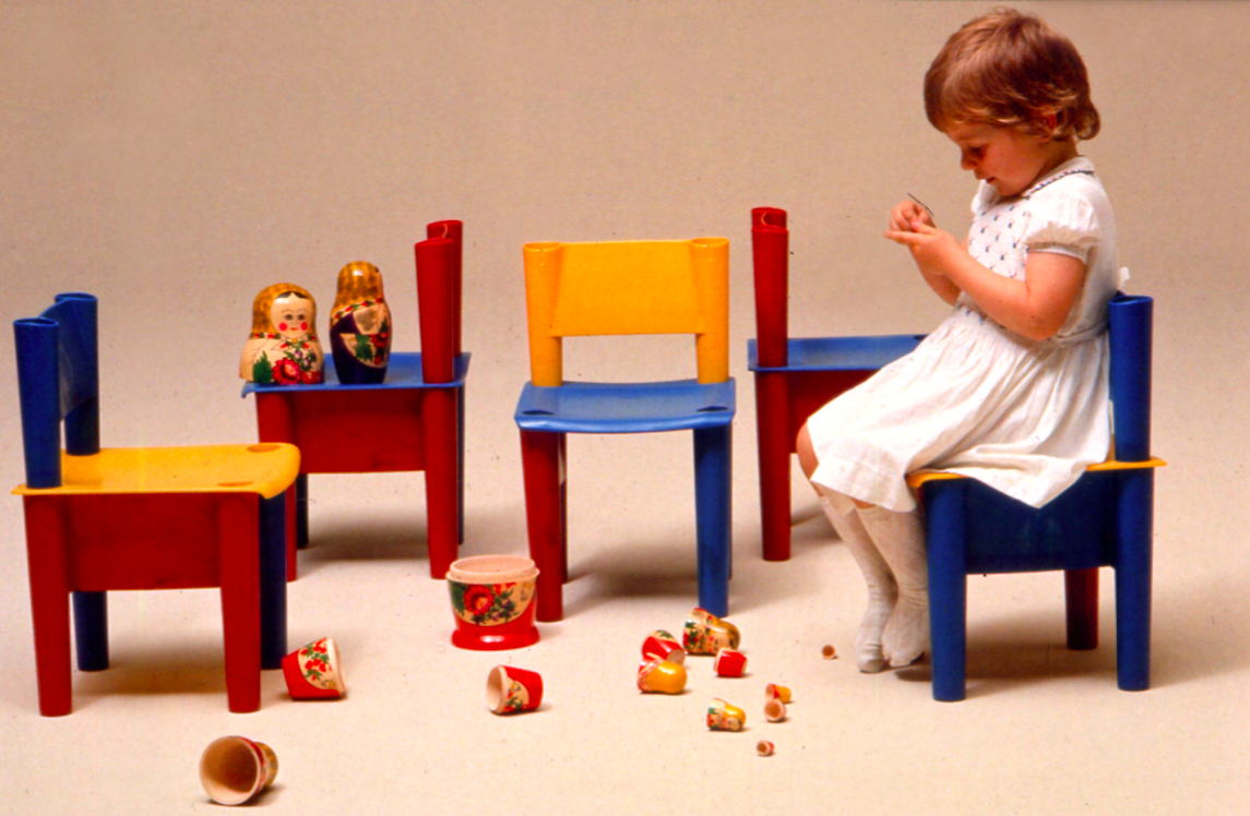 La mostra segnò il riconoscimento e l’affermazione del genio del Made in Italy a livello mondiale. In quell’occasione furono esposti cinque progetti iconici dei tre maestri: la seggiolina per bambini Junior, il sistema modulare per librerie e arredi lineari Brick System, la poltrona Joe, la poltrona Blow e la poltrona Galeotta, oggetti che rivoluzionarono negli anni Sessanta il modo di concepire l’arredo domestico. In questa sede esporremo Junior, Blow, Brick System e il modello in cemento di Joe; manca Galeotta, di cui in archivio sono presenti solo documenti cartacei, disegni e fotografie.
