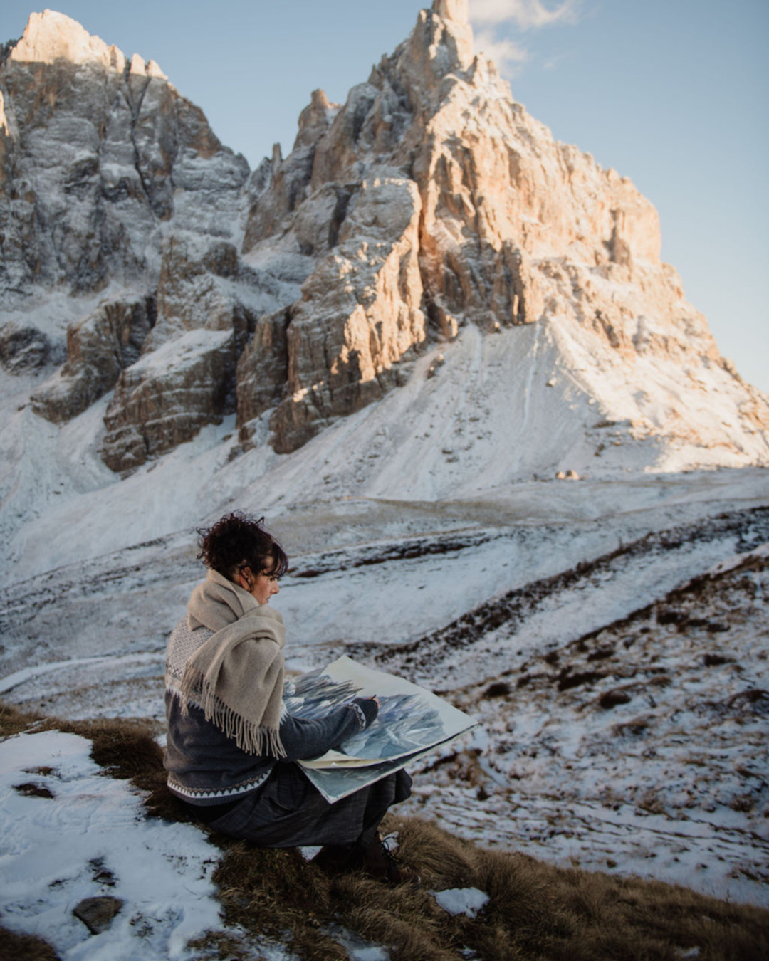 Silvia De Bastiani (Feltre, 1981) vive e lavora nella valle del Primiero, tra le Dolomiti trentine. Tra le più raffinate interpreti del paesaggio alpino contemporaneo, realizza acquerelli monumentali en plein air, spesso in condizioni estreme. Le sue opere restituiscono un’esperienza avvolgente e multisensoriale, in cui luce, atmosfera e silenzio si depositano sulla carta. La montagna diventa linguaggio identitario e materia viva, osservata con rigore quasi scientifico e restituita con poesia, precisione e profonda capacità contemplativa.
