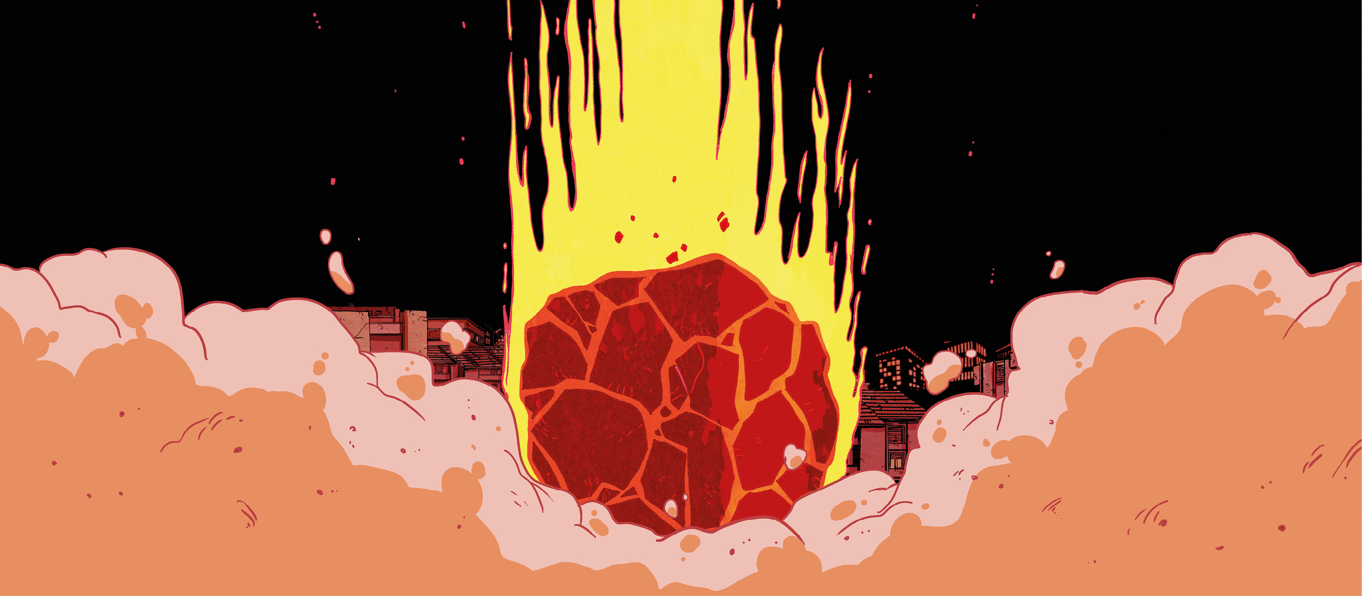 Le facciate degli edifici colpiti da un cataclisma planetario portano inevitabilmente a una riflessione su quanto le nostre vite private e il nostro contribuito nella dimensione collettiva siano cambiate a seguito della pandemia: dietro le porte tombate delle case s'intravedono gli occhi di chi cerca fughe di sopravvivenza e tentacoli di animali mostruosi.